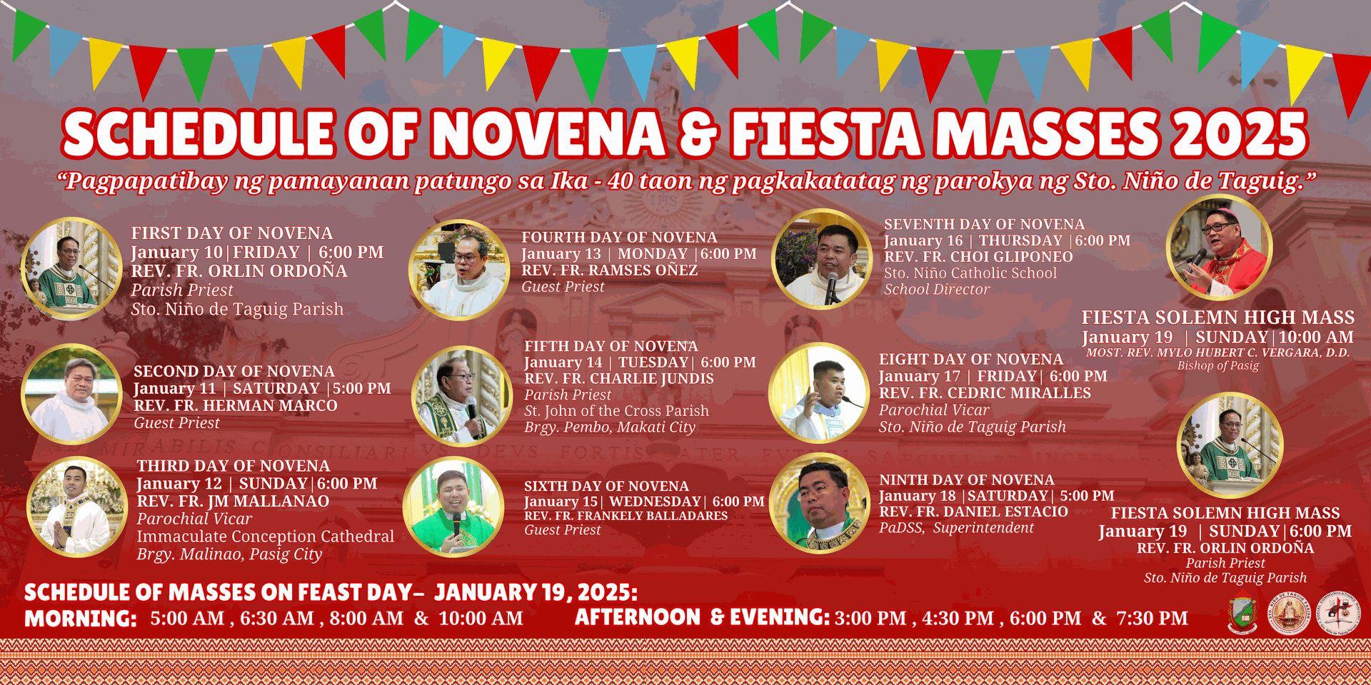 The Sto. Niño de Taguig Parish in Taguig City celebrates its Novena and Fiesta Masses in January 2025. This year’s celebration theme is "Pagpapatibay ng pamayanan patungo sa Ika-40 taon ng pagkakatatag ng parokya ng Sto. Niño de Taguig."