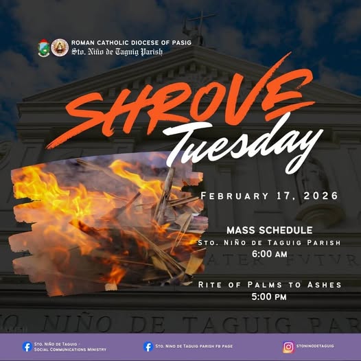 Bago po ang Miyerkules ng Abo, tayo ay may Shrove Tuesday. Ito po ang araw ng pagsusunog ng mga palaspas upang gawing banal na abo. Inaanyayahan po ang lahat na makiisa sa mahalagang gawain na ito bilang paghahanda sa Kuwaresma.